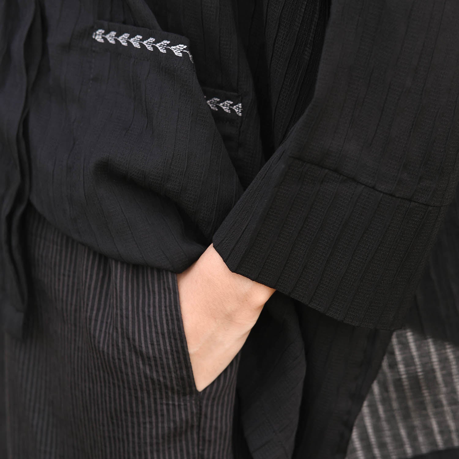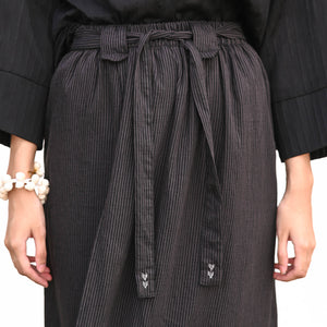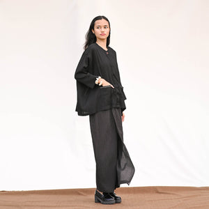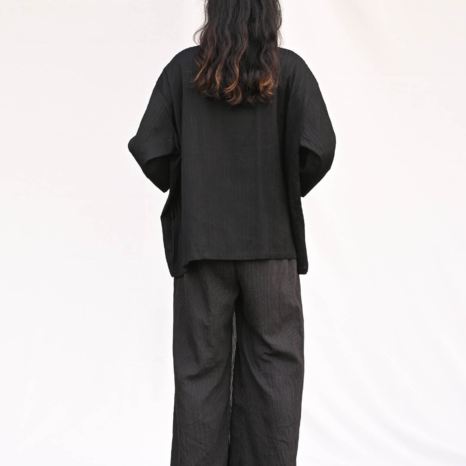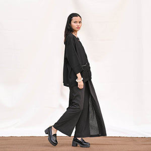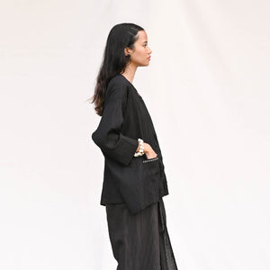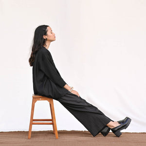 Loose top with pockets that could double up as an outerwear or a cardigan, ready to be matched with any other piece of garment in the wardrobe. Borrowing the idea of dhoti, an Indian type of sarong that resembles trousers, AMITA wrap-pants are tied around the waist, forming pleats and textures. While the outfit is available in black, it is also available in other pastel colours, giving us even more options to style and play with practicality and flexibility. At ease, at home.