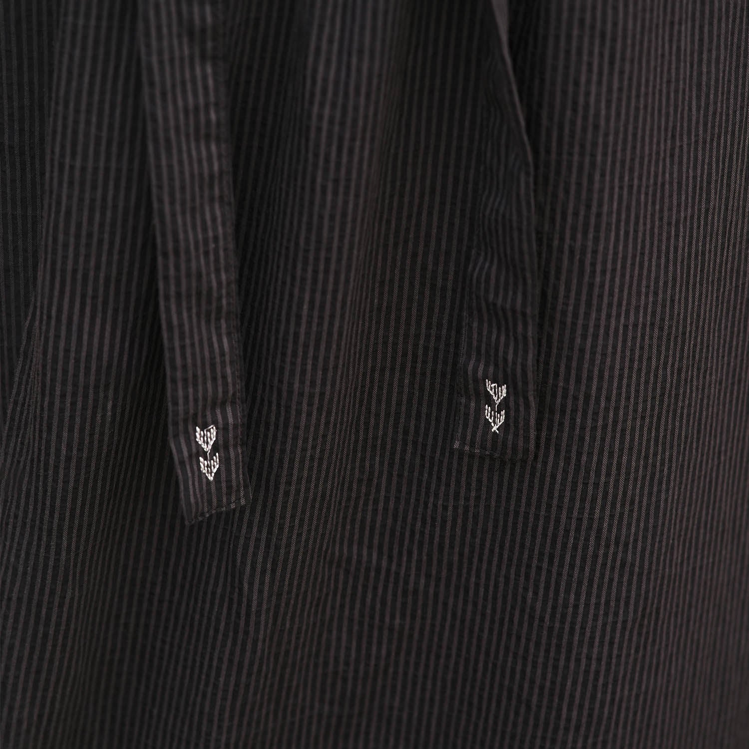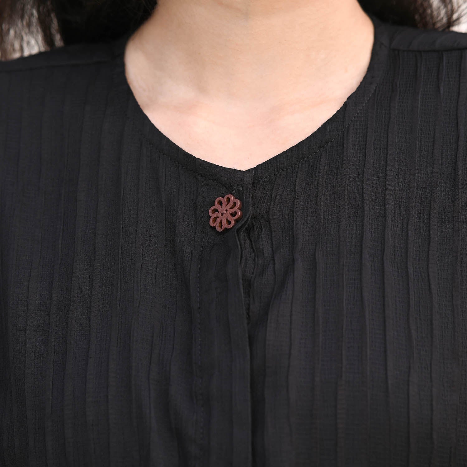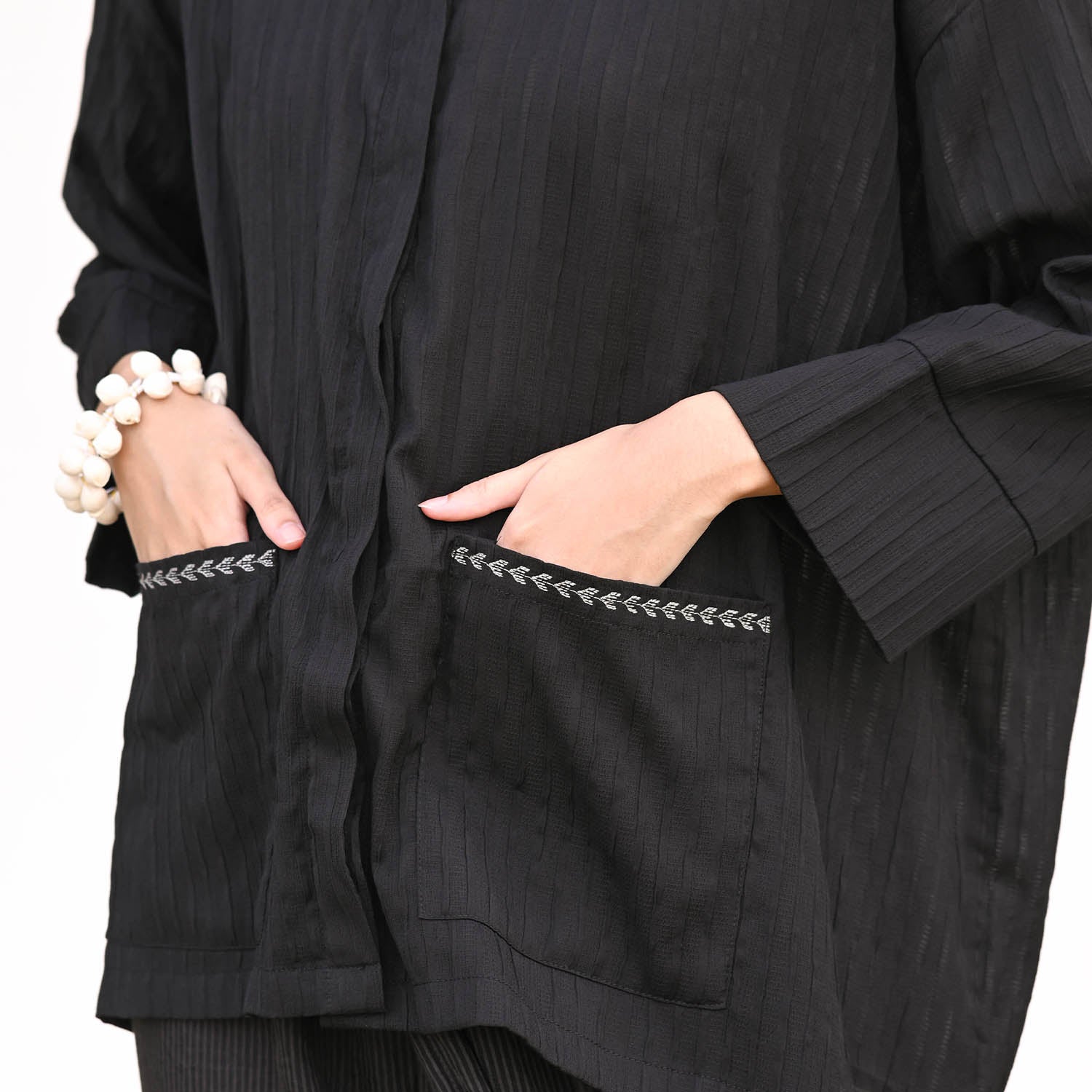Loose top with pockets that could double up as an outerwear or a cardigan, ready to be matched with any other piece of garment in the wardrobe. Borrowing the idea of dhoti, an Indian type of sarong that resembles trousers, AMITA wrap-pants are tied around the waist, forming pleats and textures. While the outfit is available in black, it is also available in other pastel colours, giving us even more options to style and play with practicality and flexibility. At ease, at home.
