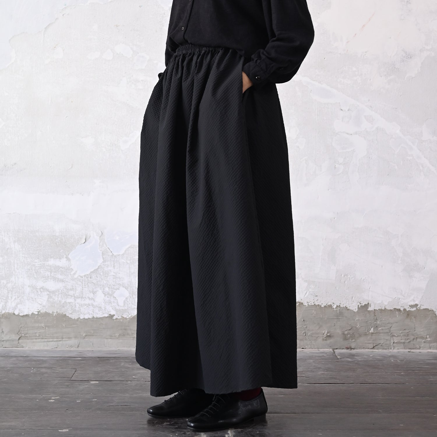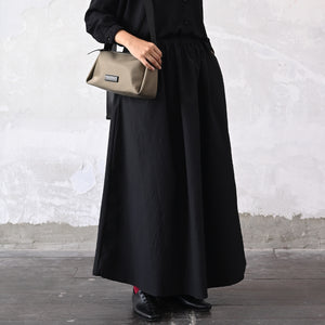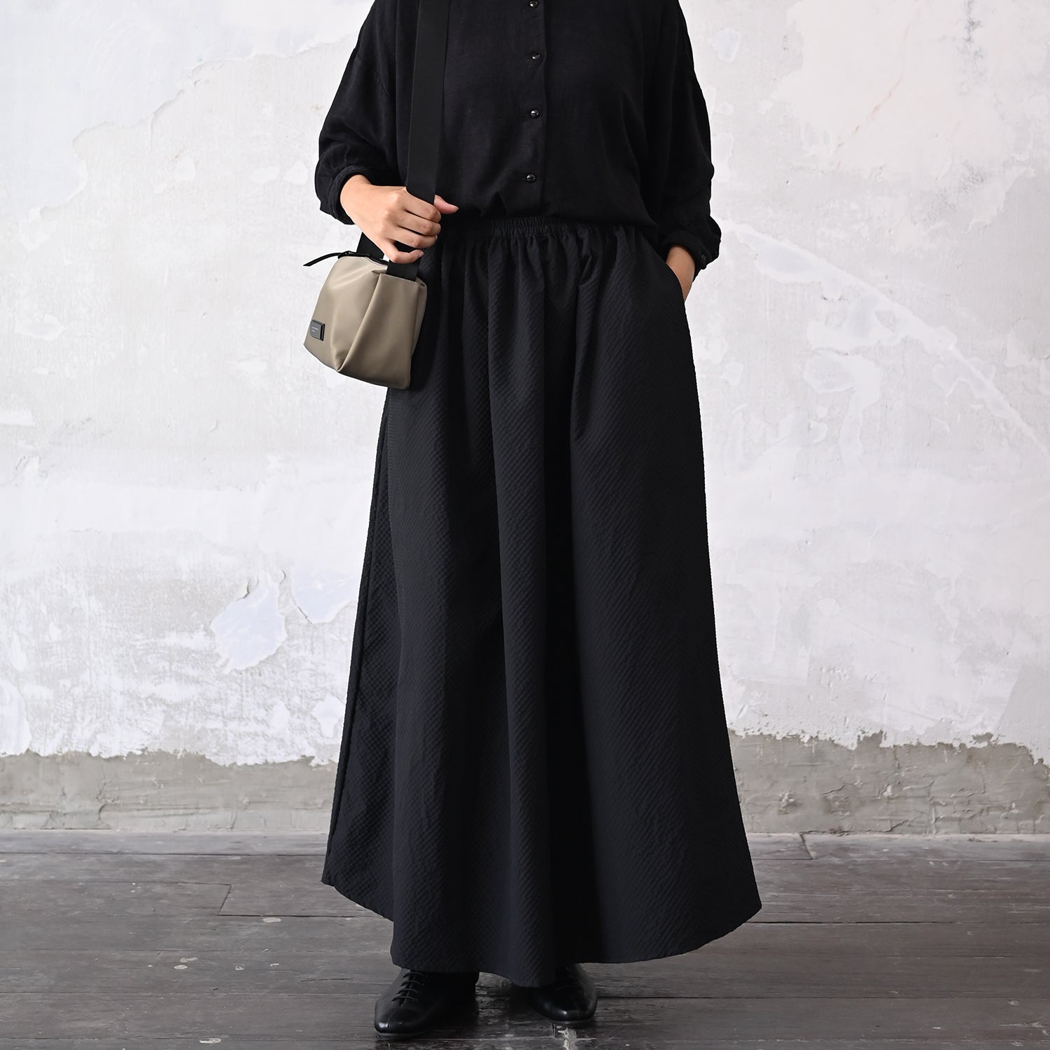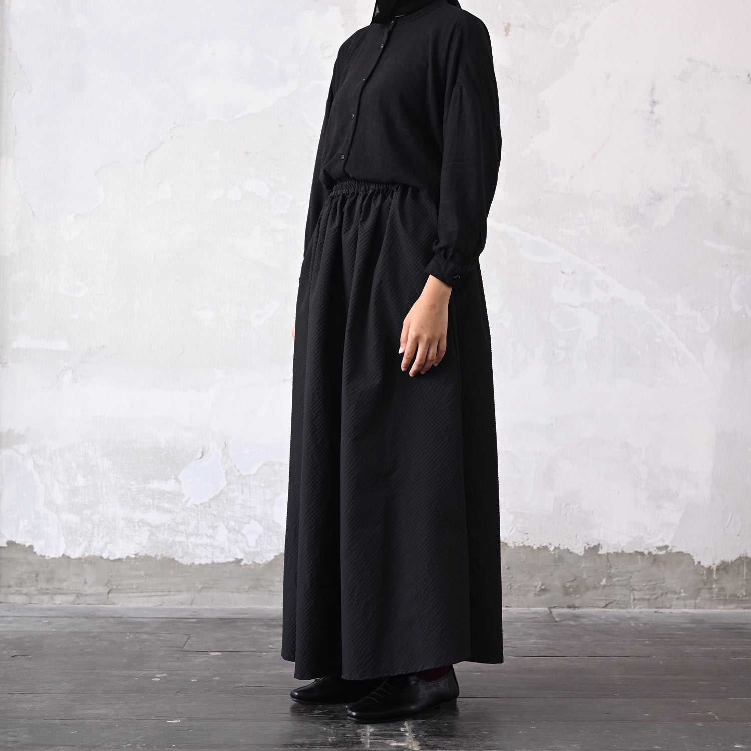 Crafted from a nylon–polyester blend, this skirt is lightweight, ironless, and water-resistant, making it a practical yet stylish choice for everyday wear. The fully elastic waistband ensures comfort without the need for zippers, while the flared silhouette provides generous leg room and graceful movement throughout the day.