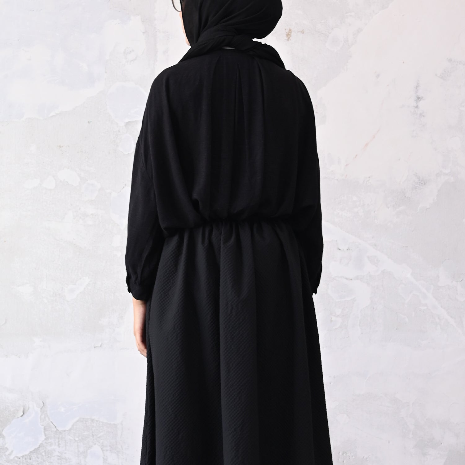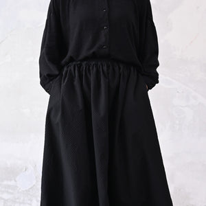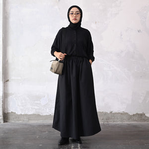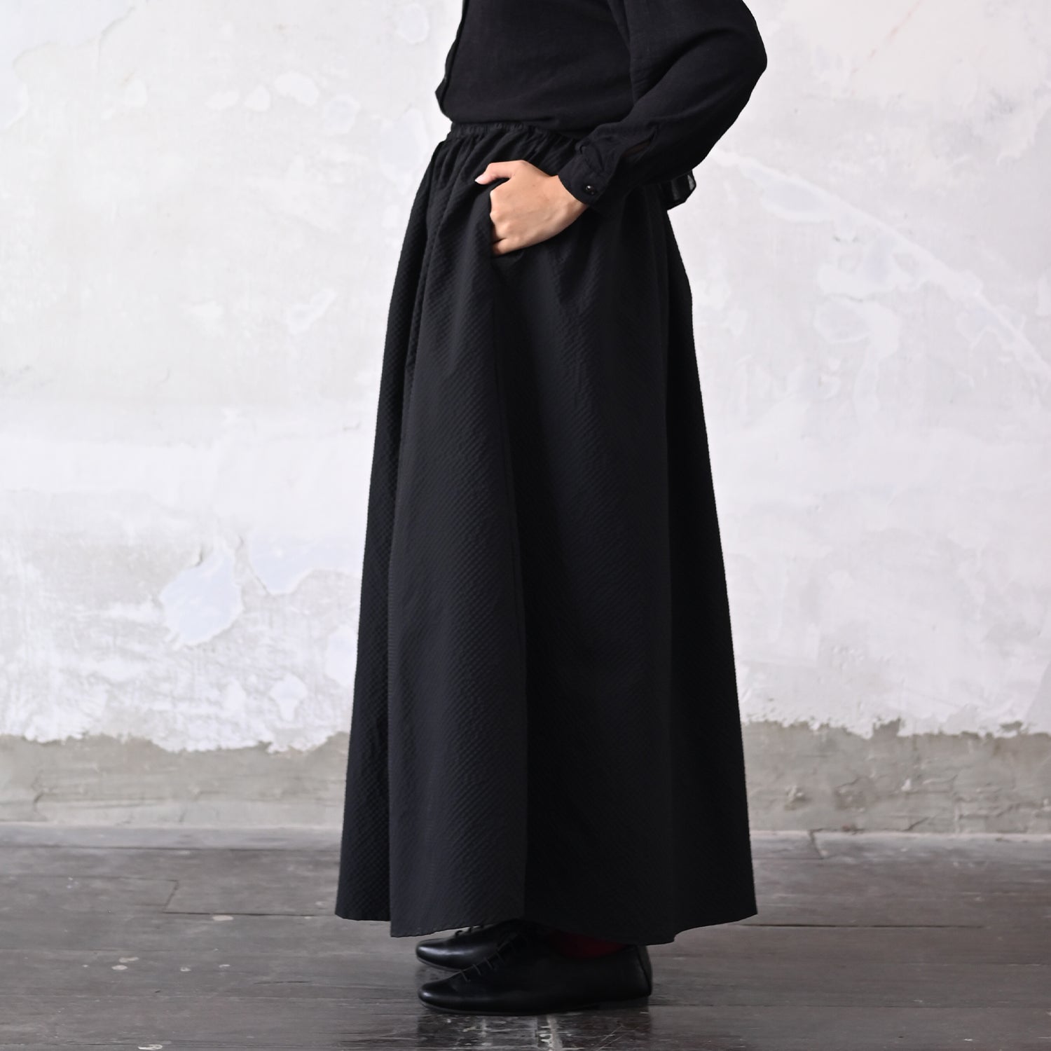 Crafted from a nylon–polyester blend, this skirt is lightweight, ironless, and water-resistant, making it a practical yet stylish choice for everyday wear. The fully elastic waistband ensures comfort without the need for zippers, while the flared silhouette provides generous leg room and graceful movement throughout the day.