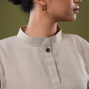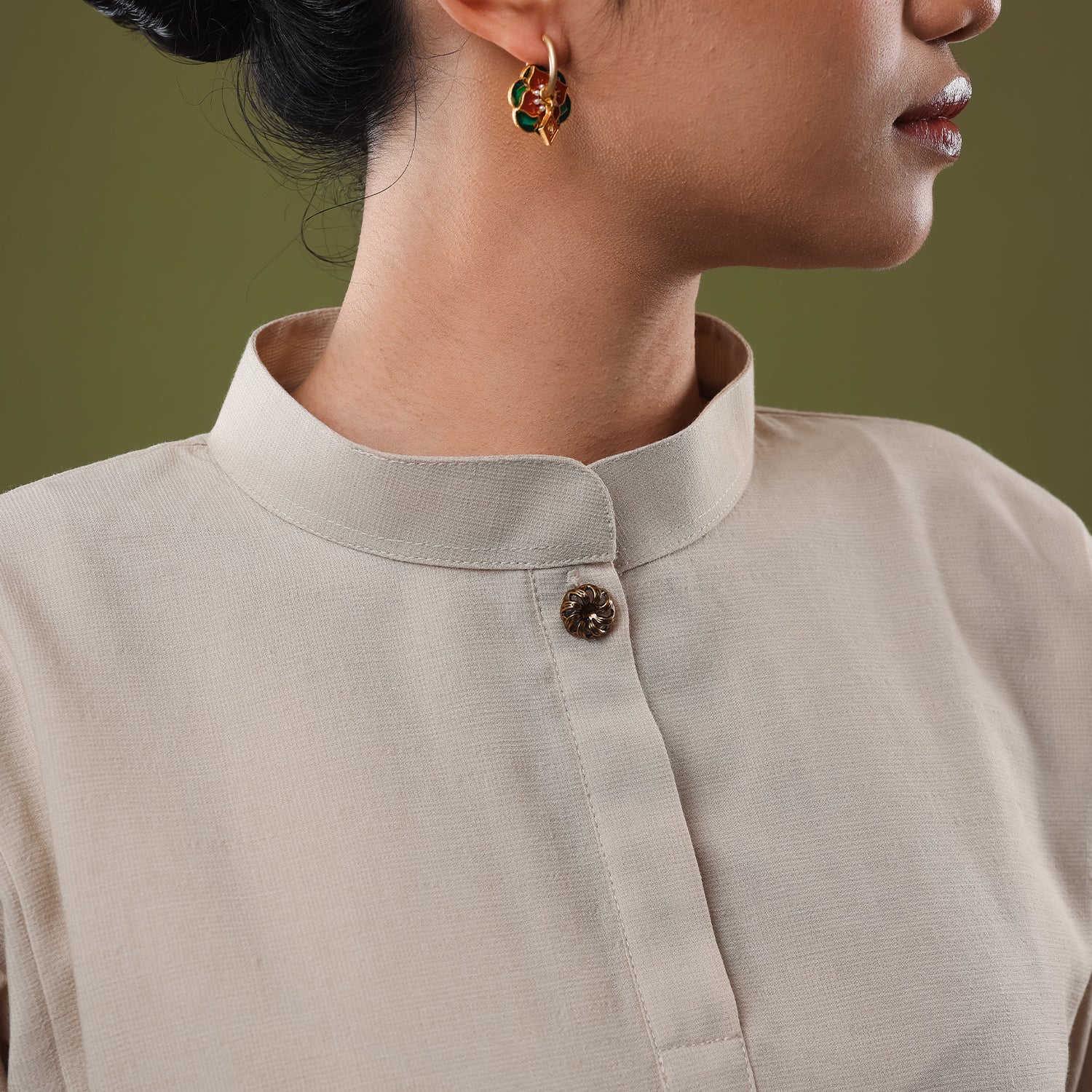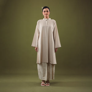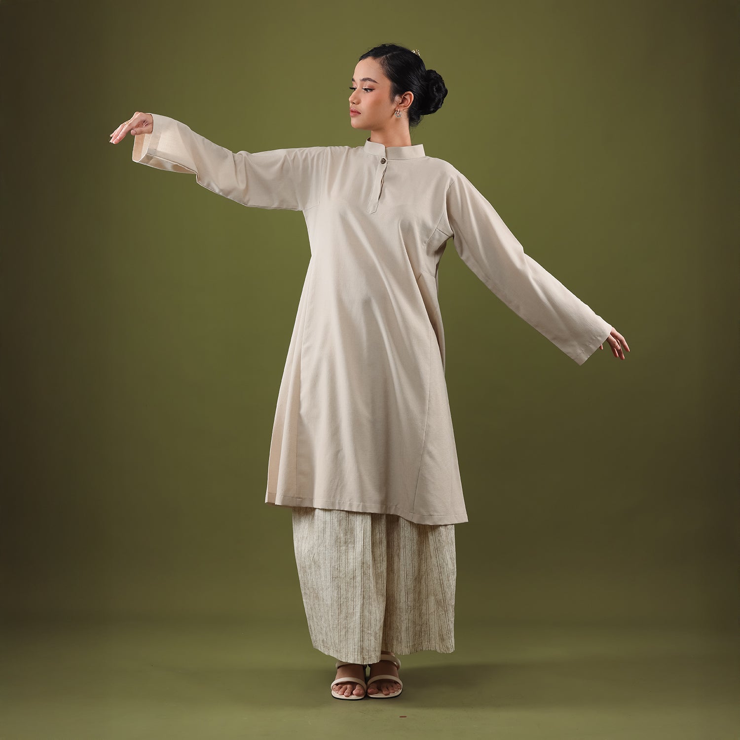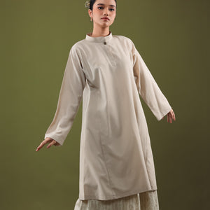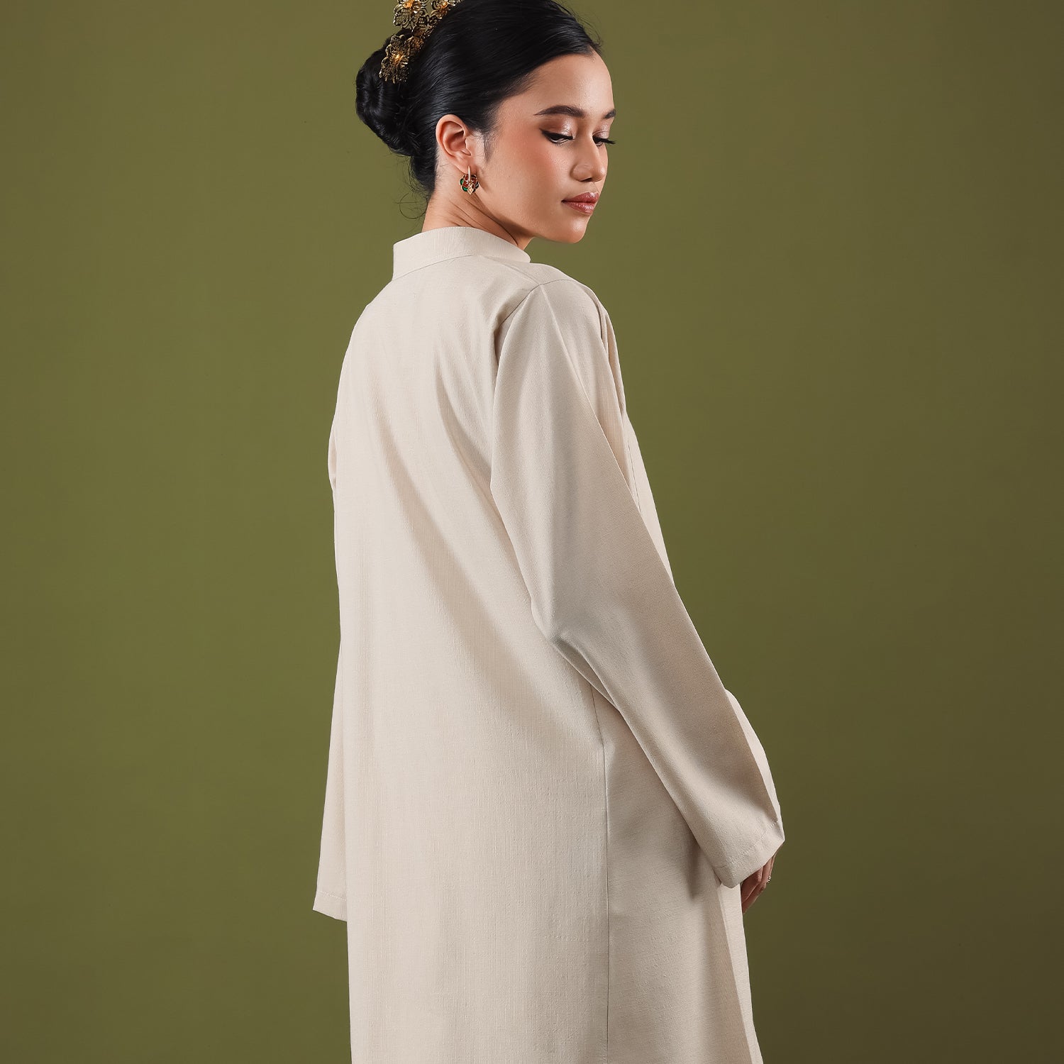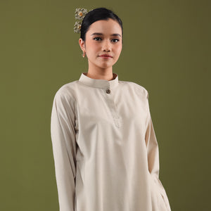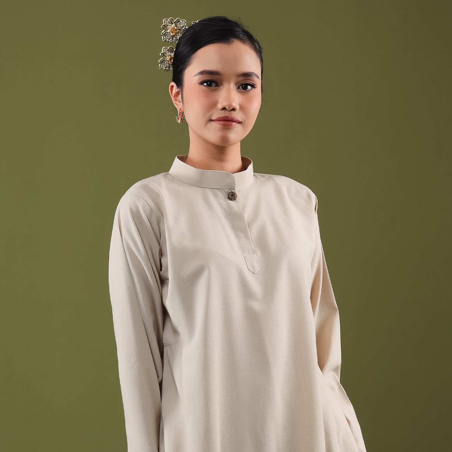 The Rahayu Top is crafted from premium cotton fabric, ensuring both comfort and elegance. Designed in the classic Kurung Pahang silhouette, it embodies modesty with a refined touch. The mandarin collar adds a structured, graceful appeal, while the custom-made brass buttons enhance its luxurious and timeless aesthetic.