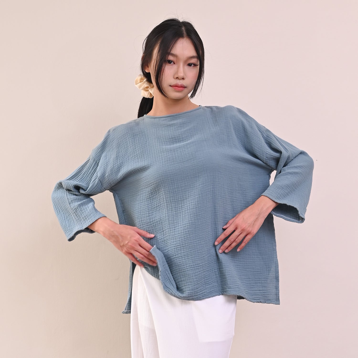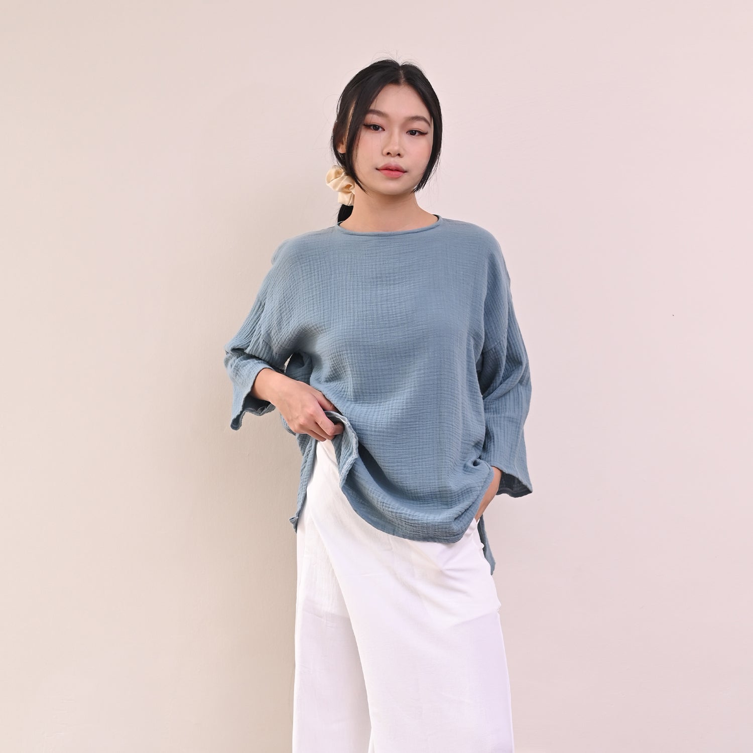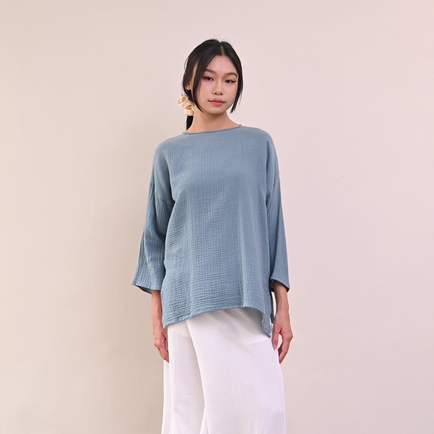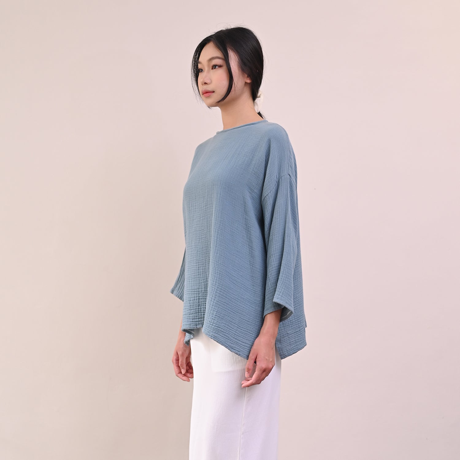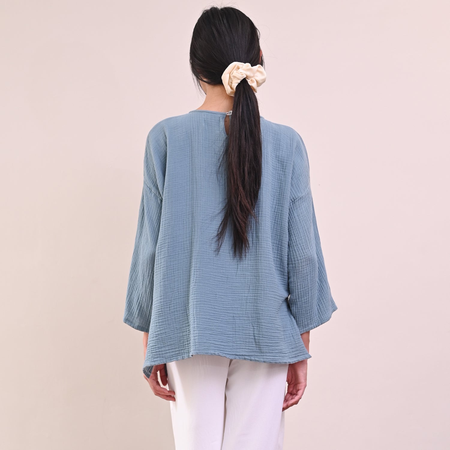 This Tenang Top is crafted from soft, lightweight cotton gauze, providing comfortable, breathable wear you can enjoy all day. With a loose cut design and round collar, it's easy to style the Tenang Top with your favorite looks for a chic, everyday look. Button closure at the back allows for easy wear and quick adjustments.